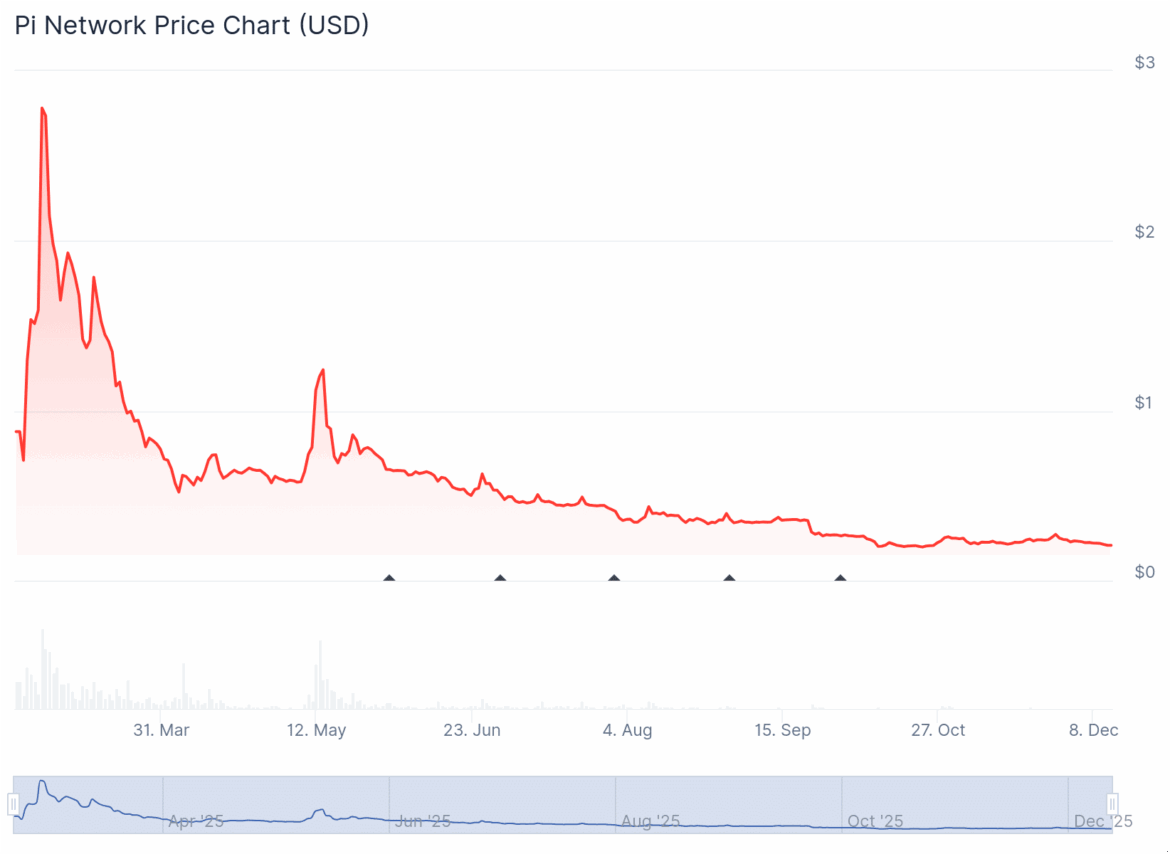 If that level fails, PI risks revisiting the October 10 low at $0.1533, effectively resetting to an all-time low zone.